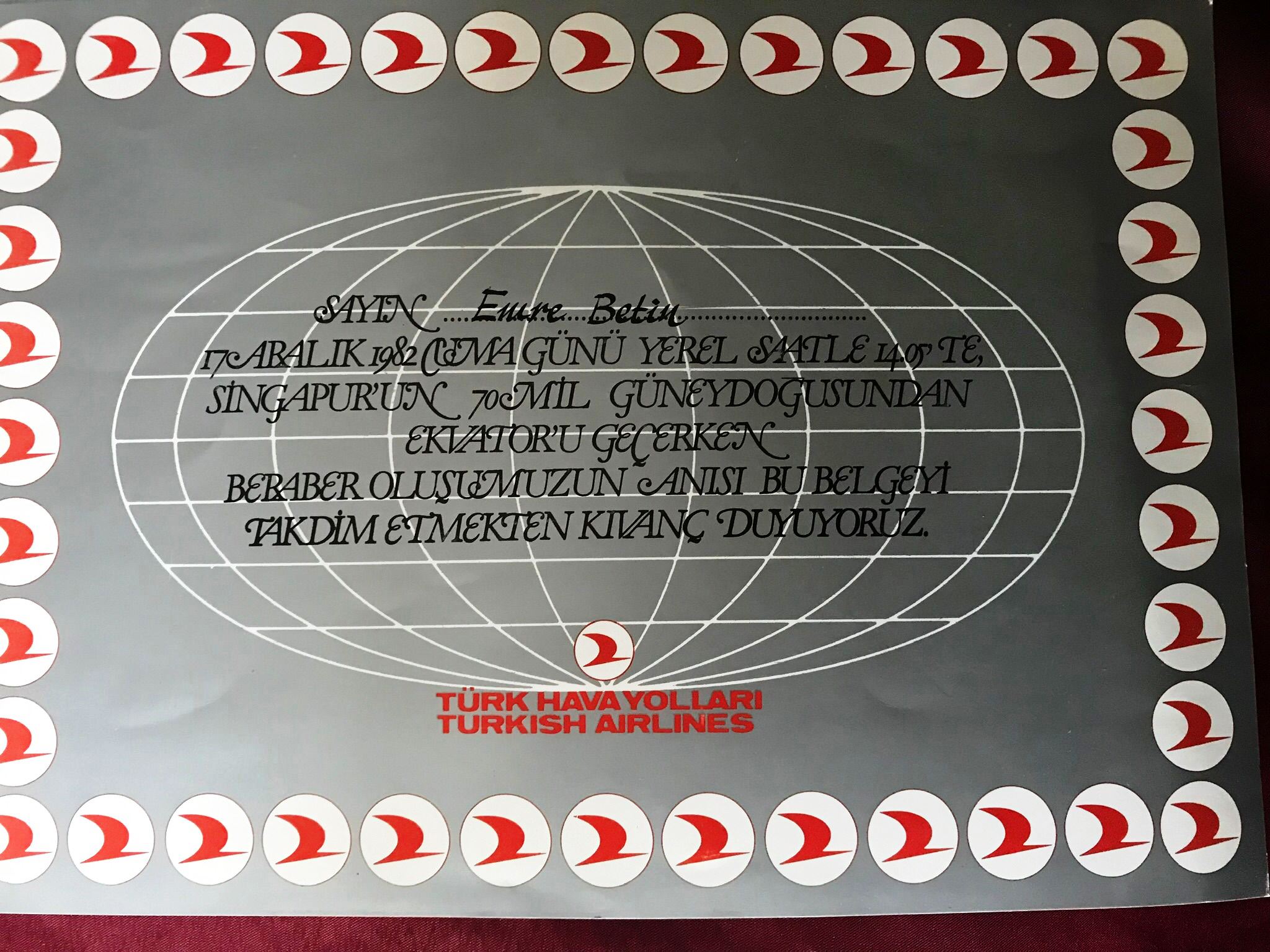 “Sayın Hasan Cemal; 17 Aralık 1982 Cuma günü yerel saatle 14:05’te, Singapur’un 70 mil güneydoğusunda Ekvator’u geçerken beraber oluşumuzun anısına bu belgeyi takdim etmekten kıvanç duyuyoruz.”
