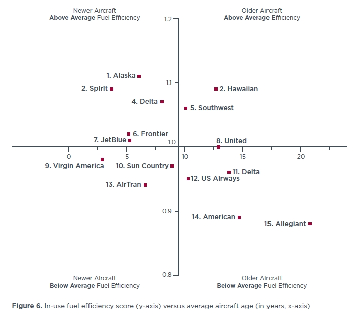 Araştırmanın sonuçlarına göre 2010 yılında ABD iç hatlarında akaryakıtını en verimli kullanan ilk üç firma; Alaska Airlines, Spirit Airlines ve Hawaiian Airlines olurken, AirTran Airways, American Airlines ve Allegiant Airlines bu listenin en sonunda yer alan havayolu şirketleri olarak dikkat çekiyor.