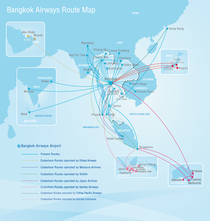 “Asya’nın Butik Havayolu Şirketi” sloganını kullanan Bangkok Airways; Singapur, Puket, Samui, Male gibi önemli ticaret ve turizm merkezlerine seferler düzenliyor.