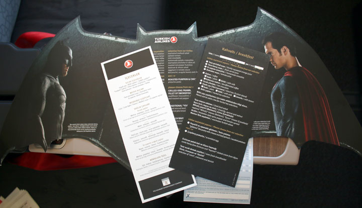 Yolculara dağıtılan seyahat çantası yani amenity kitlerde de filmin logoları var.THY’nin Amerika uçuşlarında yolculara özel menü kartı dağıtılıyor.Superman ve Batman logolu pastalar büyük ilgi görüyor.