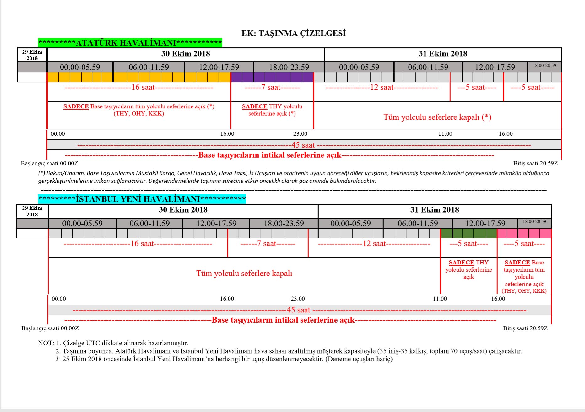 25 – 30 Ekim 2018 saat 00:00 tarihleri arasında; Yeni Havalimanı’na sadece base taşıyıcılar (THY, AtlasGlobal, Onur Air) tarafından sınırlı sayıda intikal uçuşları düzenlenecek.