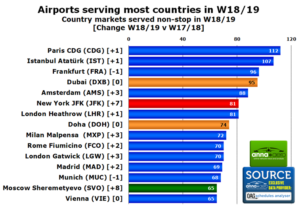 Anna.aero tarafından hazırlanan bir rapora göre IST, 2018/19 kış tarifesi döneminde, direkt olarak sefer yapılan 259 destinasyonla yine zirvede yer aldı.