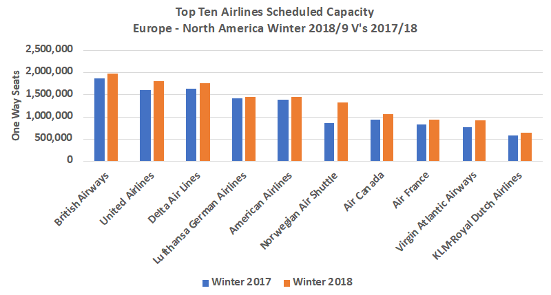 Avrupa ile Kuzey Amerika arasında en yoğun uçuş yapan ilk 10 havayolunun tamamı kapasite artışına gitmiş.