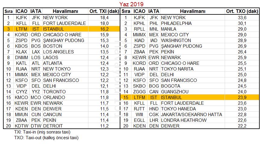 2019 yılı yaz dönemine göre hazırlanan tablo, taxi-in ve taxi-out olmak üzere iki bölüme ayrılıyor.