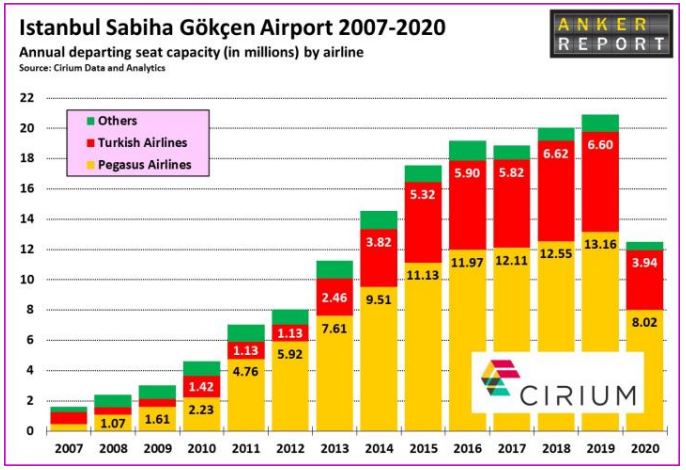 Anker Report tarafından hazırlanan bir grafikte, 2007-2020 döneminde SAW’daki arz edilen koltuk sayısı ele alınmış. (Giden uçuşlar)
