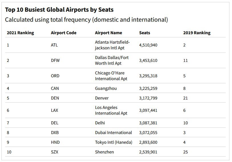 Singapur (23), Hong Kong (27), Seul Incheon (45) ve Bangkok (63) gibi havalimanları çok geride kalırken, Denver ve Shenzhen gibi normalde ilk yirmide olmayan havalimanlarının üst sıralarda olması bunu kanıtlıyor.