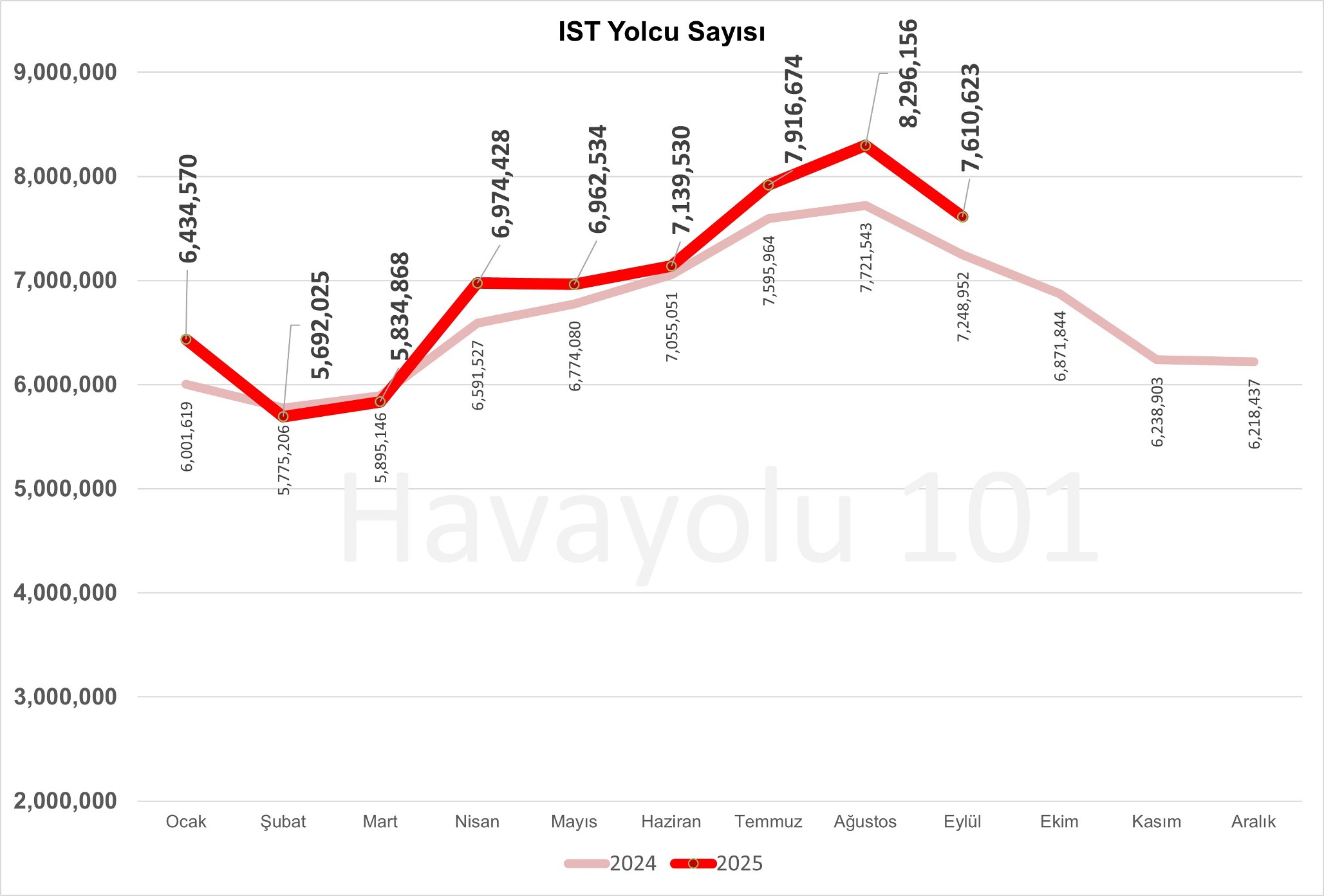 Bunun sonucunda IST’teki toplam yolcu sayısı yüzde 5 oranında artarak 7,6 milyona ulaştı.