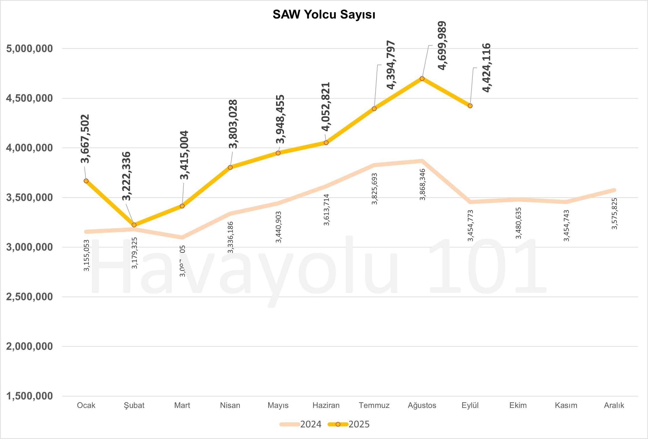 SAW’da iç hatlarda yüzde 25,4 ve dış hatlarda yüzde 30,3 gibi son derece güçlü büyüme oranlarına imza atılırken, toplam yolcu sayısı, Eylül 2024’e kıyasla yüzde 28,1 yükselerek 4,4 milyona çıktı.