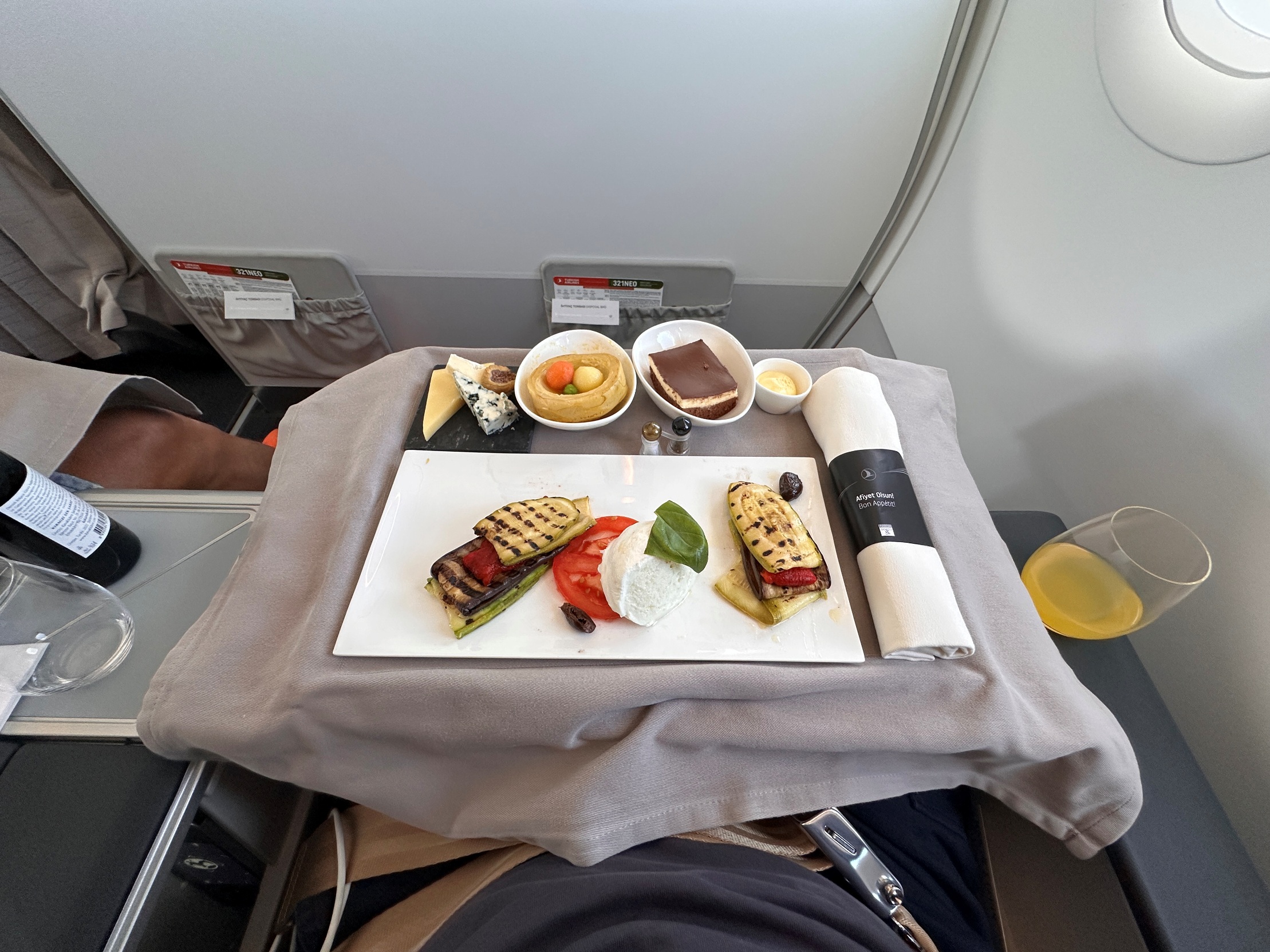 Gidiş uçuşumuzda ana yemek olarak kuzu incik, tavuk ve makarna (Cappellacci) vardı. (TK INT_BC_HMBG_ROT3)