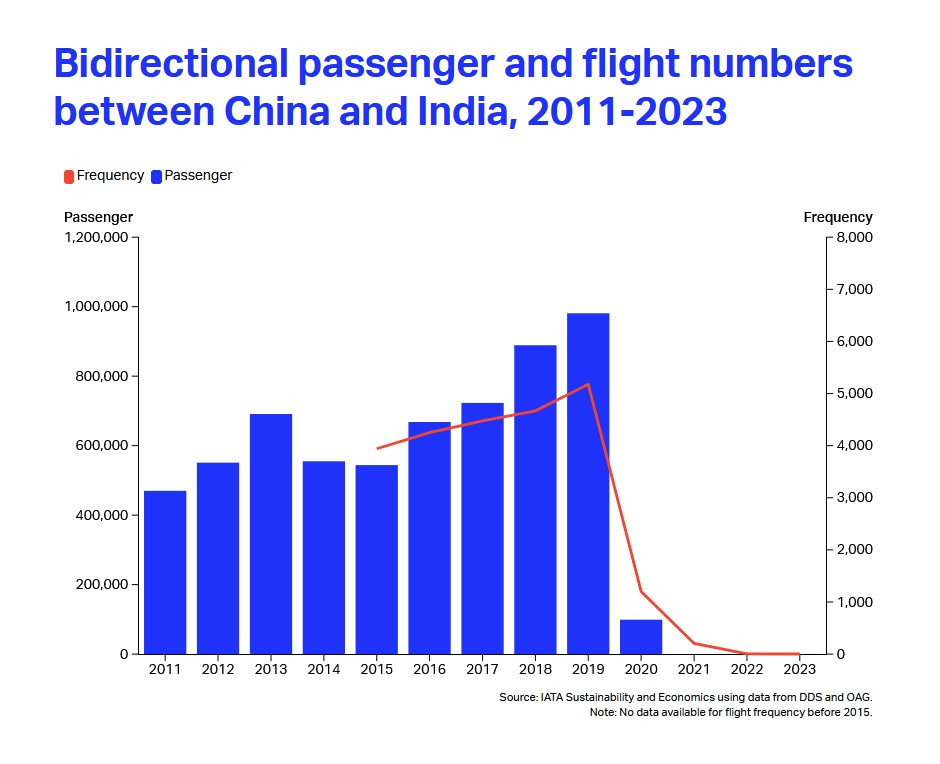 IATA’nın hazırladığı bir grafikte, Hindistan ile Çin arasındaki uçuş ve yolcu sayıları görülüyor.