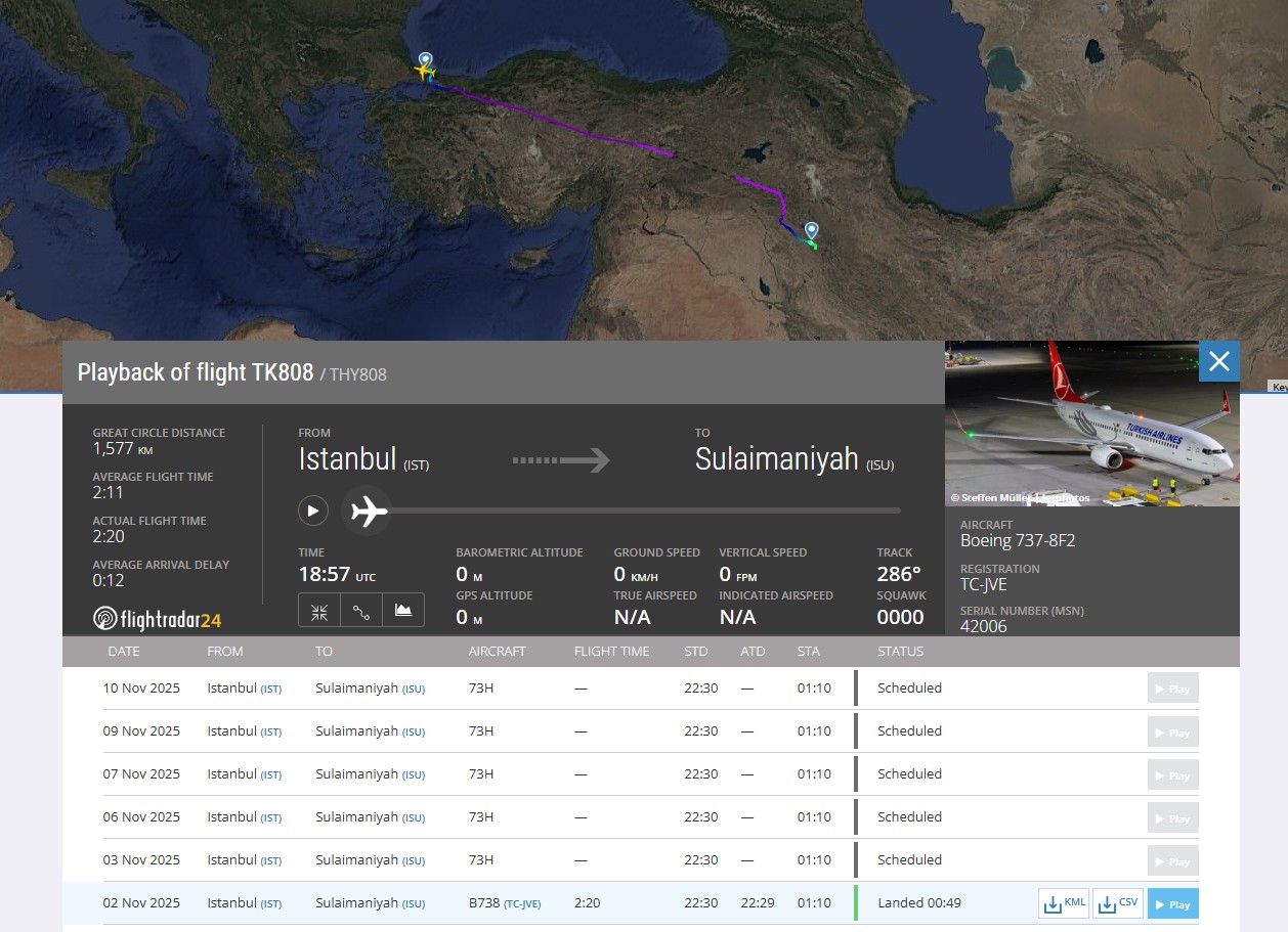 2 Kasım gecesi İstanbul’dan havalanan Boeing 737 tipi uçak (TC-JVE), 2 saat 20 dakikalık bir uçuşun ardından Süleymaniye’ye vardı.