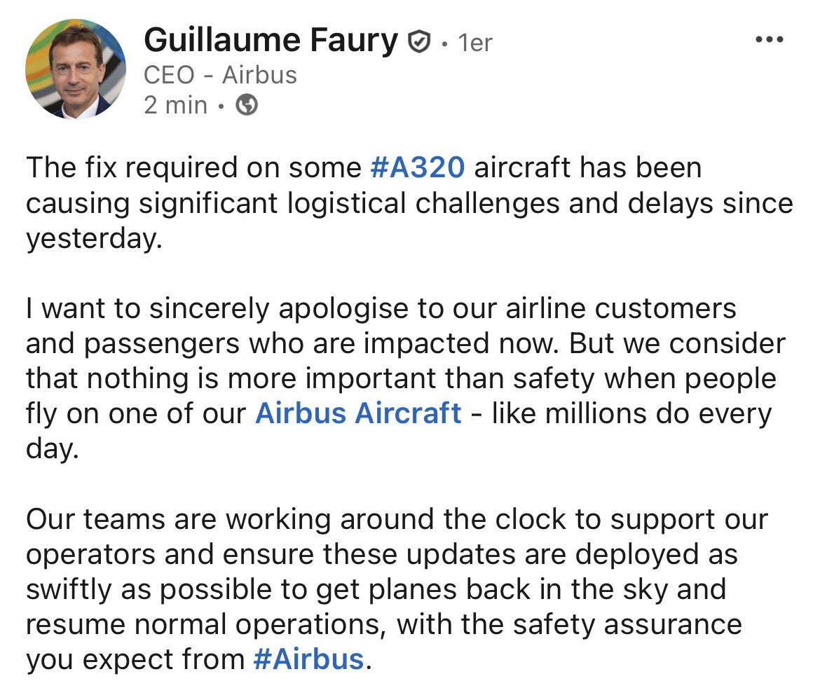 Airbus CEO’su Guillaume Faury, bir mesaj yayımlayarak kamuoyunda özür bile diledi.