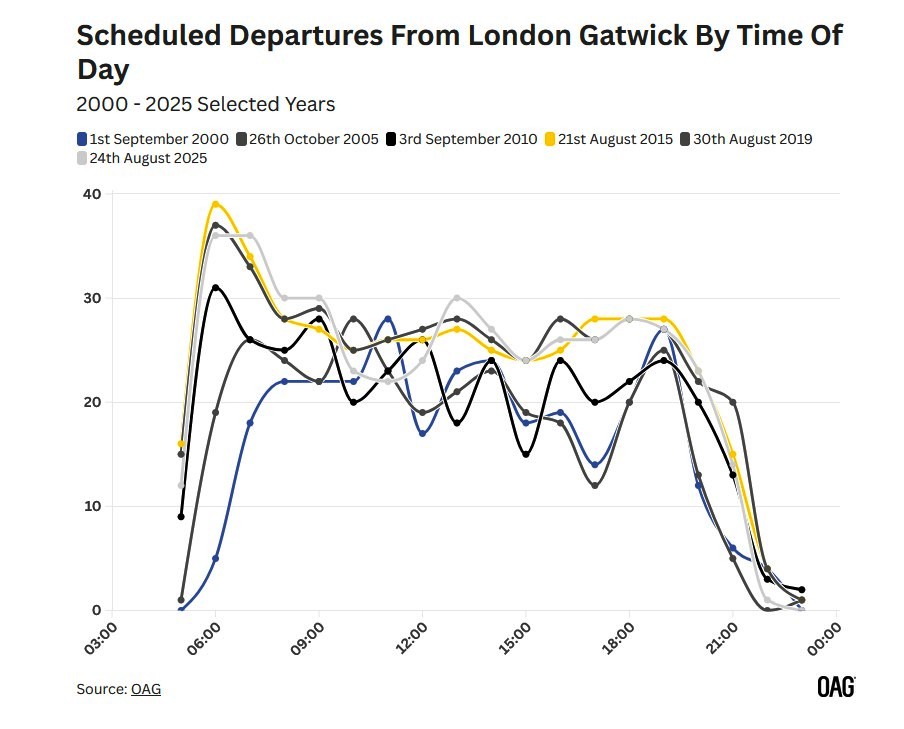 OAG’nin planlanan tarifeli uçuş verisine dayanan çalışması, Gatwick’in tek pistle kapasite sınırına doğru ilerlerken gün içi boşlukları nasıl başarıyla doldurduğunu somut biçimde ortaya koyuyor.