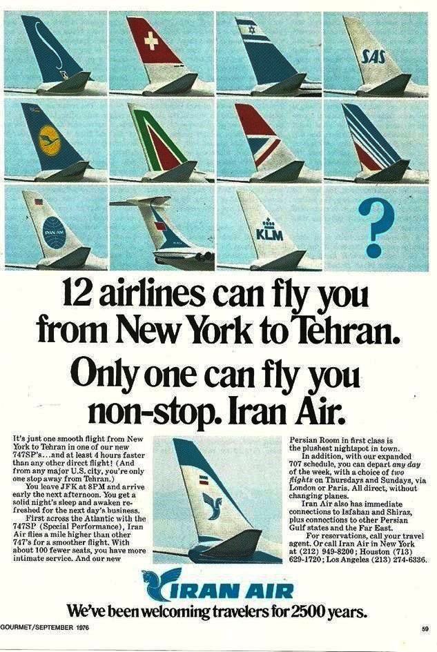 Eylül 1976’da yayımlanan reklamda, New York ile Tahran arasında 12 farklı havayolunun hizmet verdiği fakat bunlardan sadece birinin direkt uçuş yaptığı; onun da Iran Air olduğu belirtiliyor.