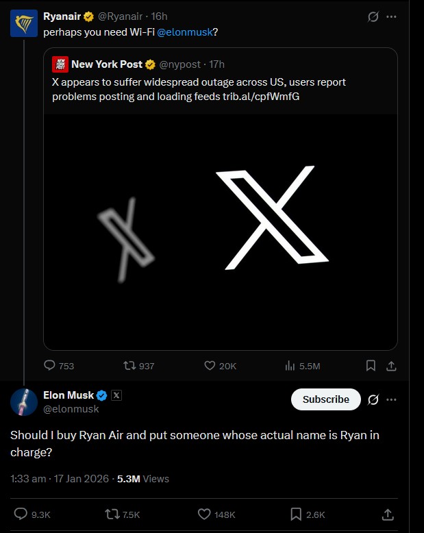 Olayın ertesi günü X’i etkileyen geniş çaplı bir kesinti yaşandı. Ryanair’in kurumsal X hesabından Elon Musk’a yönelik olarak, “Belki de wi-fi bağlantısına ihtiyacın var?” mesajı gönderildi.