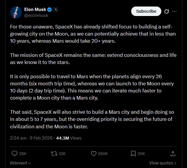 Elon Musk, Mars yerine aya gitmenin daha kolay olduğunu ve buraya odaklanacaklarını da sözlerine ekledi.