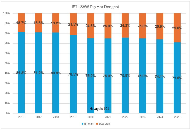 Bunun sonucunda, dış hatlarda 2016’da İstanbul’daki toplam yolcunun yüzde 18,7’si Sabiha Gökçen Havalimanı’nı (SAW) kullanırken, 2025’te bu oran yüzde 29‘a yükselmiş.