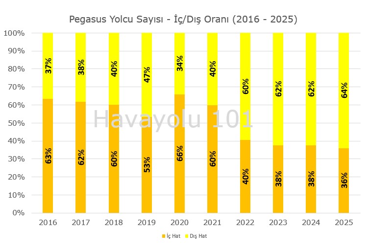 Pegasus x İç/Dış Hat Yolcu Oranı (2016 – 2025)