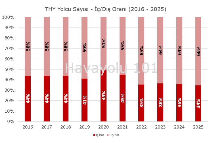 2025, THY ve Pegasus’un tarihinde, iç hat yolcu sayısı ağırlığının en düşük seviyeye indiği yıl olarak kayda geçti.