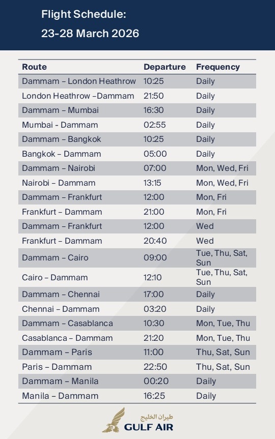 Gulf Air, bu amaçla, başkent Manama’ya 100 km kadar mesafedeki Dammam Havalimanı’ndan sınırlı sayıda uçuş planladı.