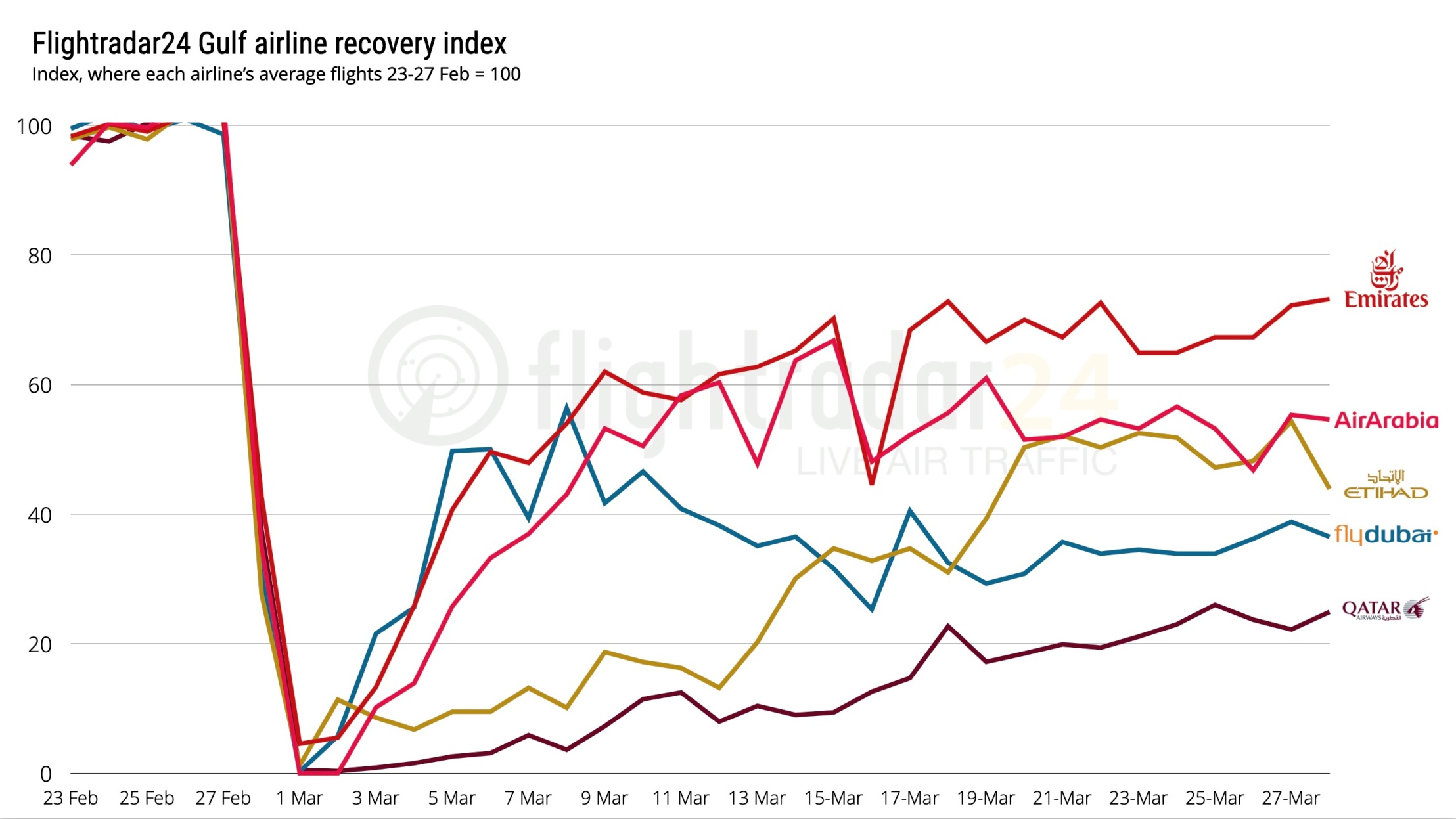 Savaşın ilk 10 gününde, bölgedeki Arz edilen Koltuk Kilometrenin (AKK), yüzde 73’ü iptal edilmiş. Sonraki günlerde bir miktar toparlanma olsa da yolcuların buradaki havayollarını kullanmaktan kaçındıkları ve ÜYK’nın düşük seviyelerde kaldığı biliniyor.