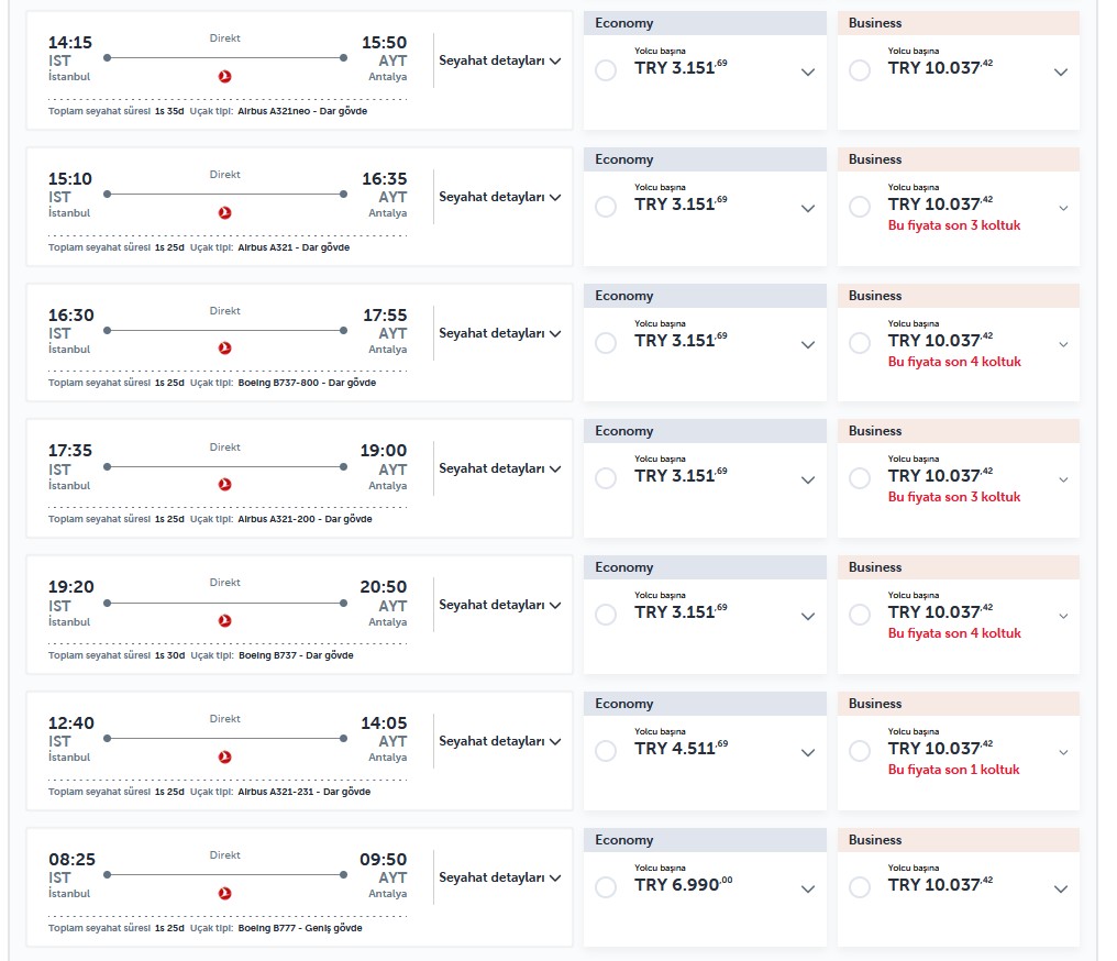 29 Mayıs 2026 günü için THY’nin İstanbul – Antalya Bilet Fiyatları (7 Nisan 2026)