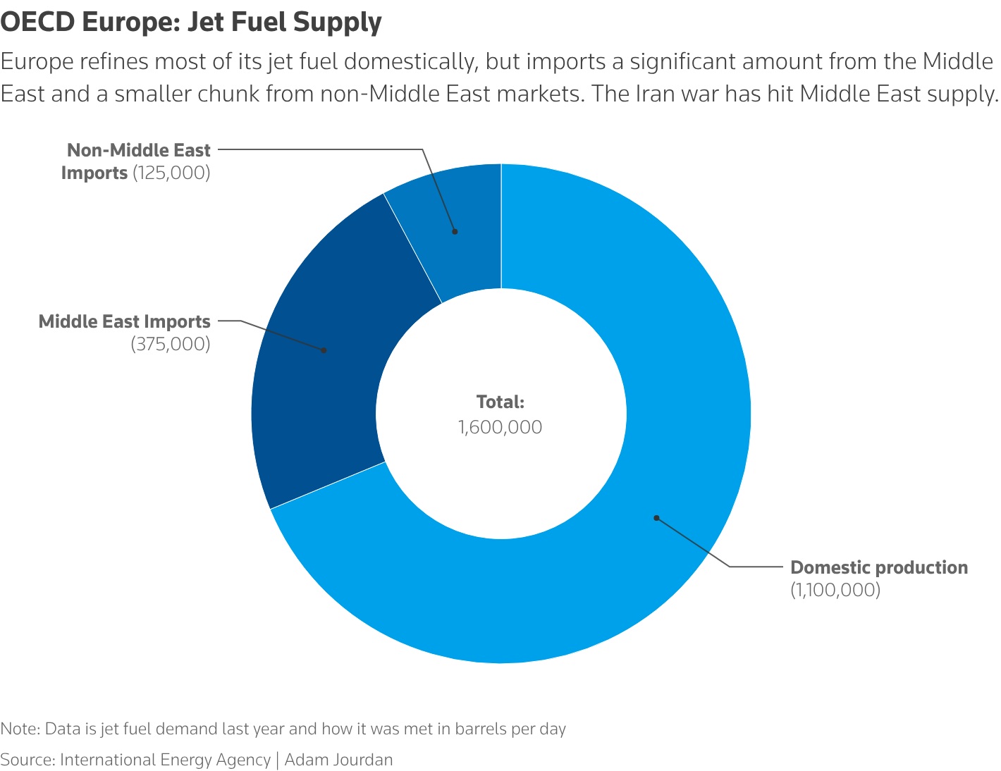 2025 verisine göre; OECD Avrupası ki bunun içinde Türkiye de var, günlük ortalama 1,6 milyon varil jet yakıtına ihtiyaç duyuyor.